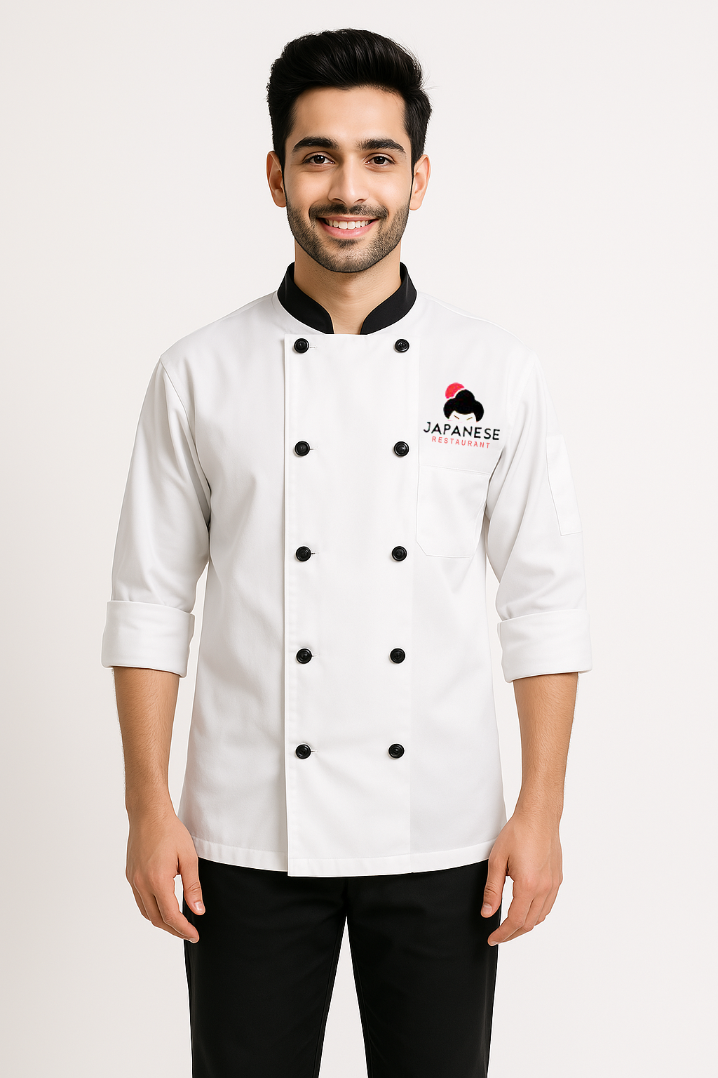 Unleash your inner chef with the versatile ChefRegal 3/4 Sleeve Chef Coat. Designed for both men and women, this comfortable and durable coat features 3/4 length sleeves and a stand-up mandarin collar for a unique look. Made with soft polycotton twill, it also includes a double-breasted front, 8 black buttons, and multiple pockets for convenience. Add your own personal touch with custom embroidery.