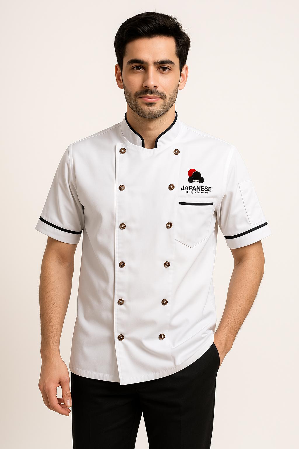 Introducing the ChefSignature Coat! This custom-made chef coat, crafted with durable poly/cotton twill fabric, features a button closure and chest pocket for added convenience. The stand-up mandarin collar and double-breasted front design exude professionalism and versatility. Add your logo and name for a personalized touch.
