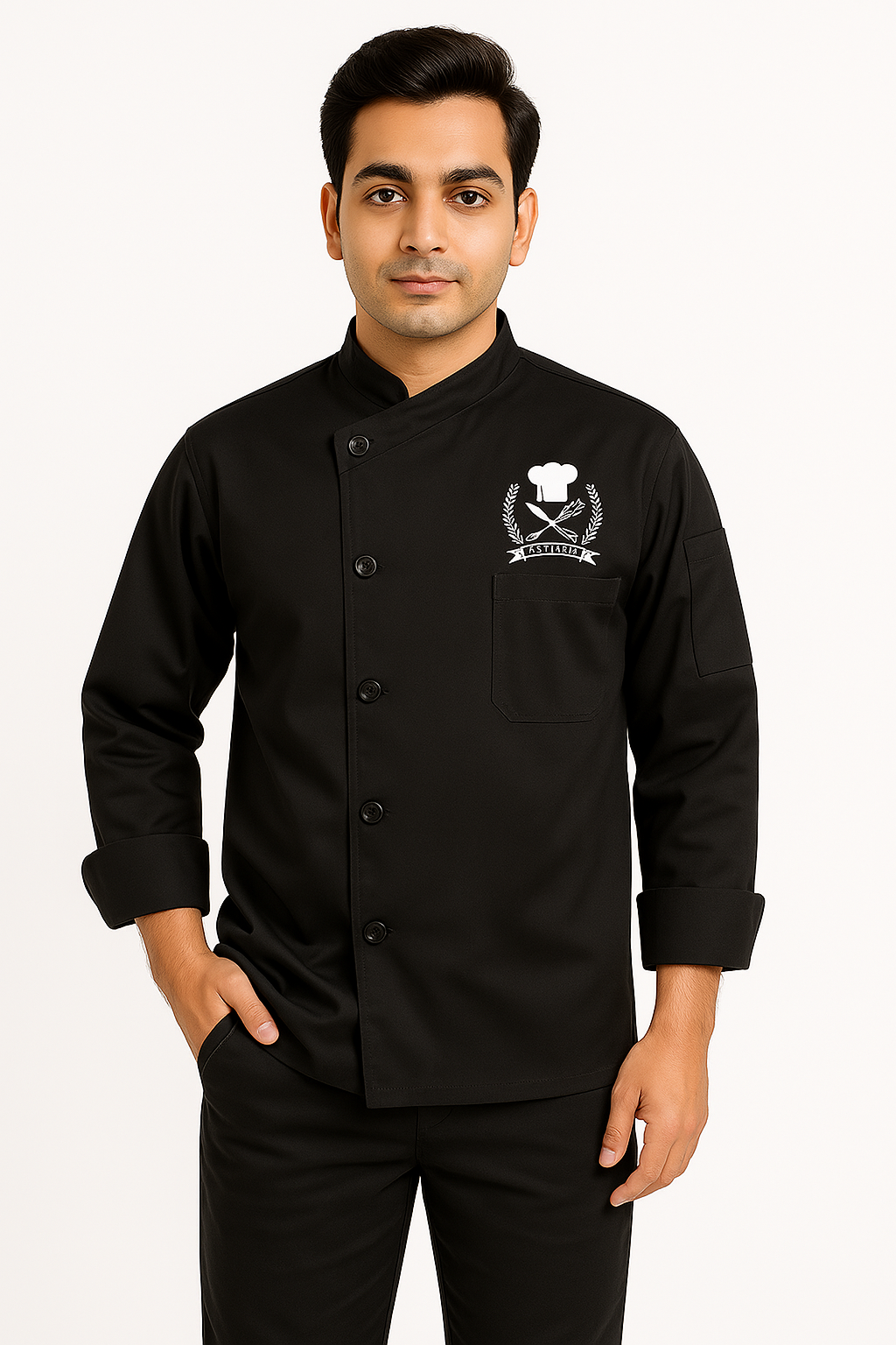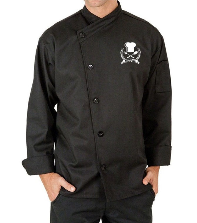 Upgrade your chef wardrobe with our CrossFlame Couture Coat. The high-quality construction boasts a cross-slant collar and button closure for an enhanced appearance. Enjoy professional-looking, easy access to your thermometer with the cuff and sleeve pockets. Our 65/35 Poly-Cotton fabric ensures durability and comfort in any kitchen. Personalize with embroidery for lasting branding exposure.