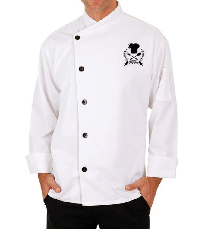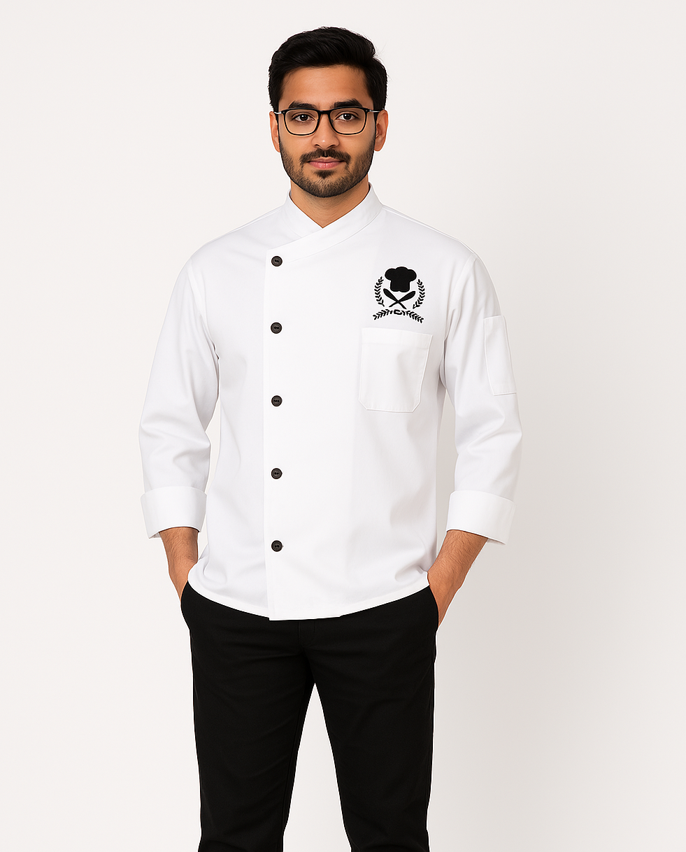 Upgrade your chef wardrobe with our CrossFlame Couture Coat. The high-quality construction boasts a cross-slant collar and button closure for an enhanced appearance. Enjoy professional-looking, easy access to your thermometer with the cuff and sleeve pockets. Our 65/35 Poly-Cotton fabric ensures durability and comfort in any kitchen. Personalize with embroidery for lasting branding exposure.