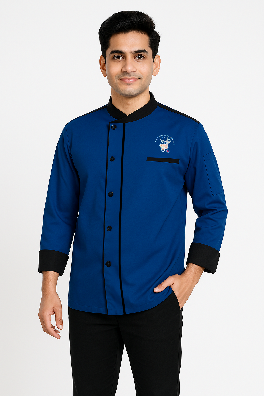 As a chef or industry expert, add a touch of style with the DuoEdge Chef Coat. The exclusive two-tone design features a trim shoulder, slant cross collar, and black cuffs for a professional and designer look. It is made of 65/35 Dark Poly and Cotton Twill fabric, making it easy to care for. With five mercer black nylon buttons and functional pockets for storage, this chef coat is both functional and stylish.