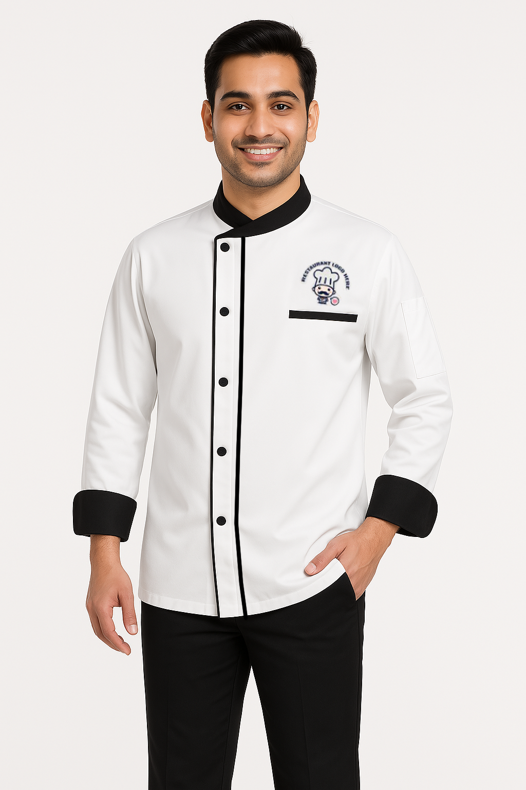 As a chef or industry expert, add a touch of style with the DuoEdge Chef Coat. The exclusive two-tone design features a trim shoulder, slant cross collar, and black cuffs for a professional and designer look. It is made of 65/35 Dark Poly and Cotton Twill fabric, making it easy to care for. With five mercer black nylon buttons and functional pockets for storage, this chef coat is both functional and stylish.