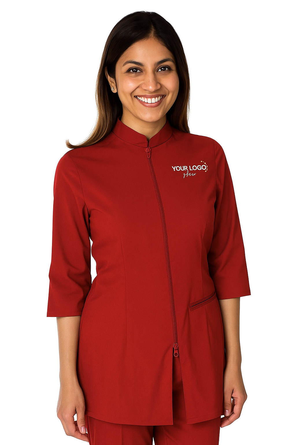 Introducing our Salon Style Tunic - a stylish and comfortable choice for hairdressers and beauty experts. Made from durable PC fabric, this tunic features a lower pocket, zip closure, and the option to add your salon logo for a personalized touch. Available in multiple colors for individual or bulk orders.
