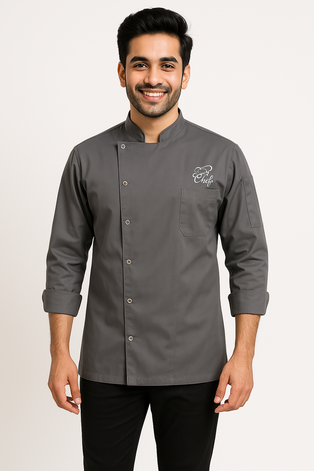 Introducing the SnapFit Custom Chef Coat. This exclusive designer coat features a slant collar, snap button closure, and two convenient pockets. Made from high-quality polyester-cotton twill fabric, it offers unisex sizing for a comfortable fit. Personalize it with your name and logo for a professional touch.